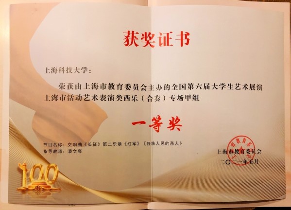荣获全国第六届大学生艺术展演上海市活动艺术表演类西乐(合奏)专场甲组一等奖