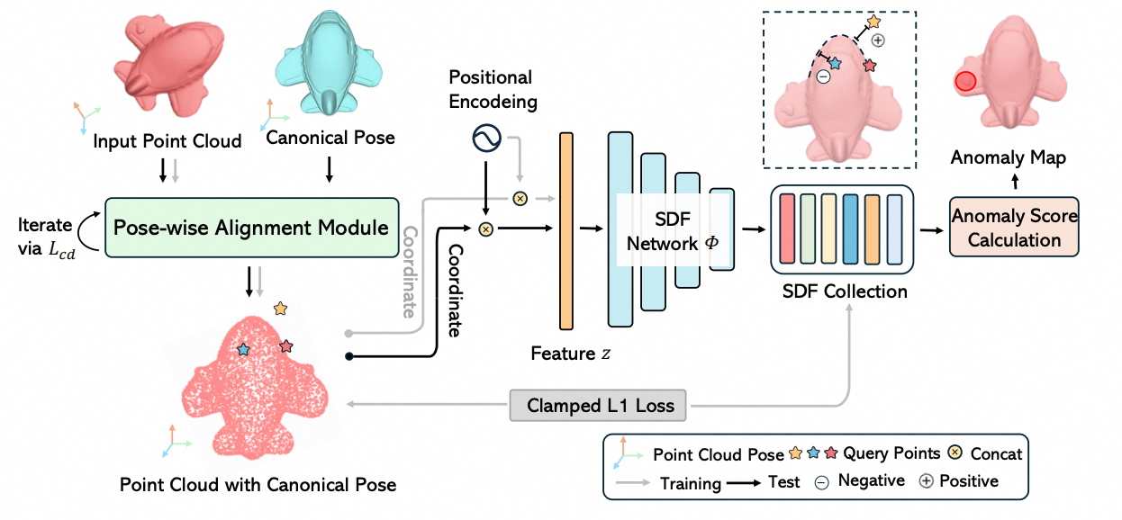 在高端装备的智能质检领域,三维点云数据因空间信息丰富,已成为产品外形检测的主流。然而,传统离散化表达方法往往难以精准捕捉细小的几何结构异常,且对物体姿态变化的鲁棒性不足,导致工业场景下关键外形缺陷难以及时发现和修复,成为工业质检智能化升级的瓶颈。武颖娜团队与密歇根大学安娜堡分校研究团队提出的PASDF(Pose-Aware Signed Distance Field)方法,采用连续、高精度的有符号距离场,并结合姿态自适应的对齐模块,能够实现对物体三维异常的精准定位和高质量自动修复,突破了现有方法在精度和适用性方面的瓶颈。实验结果显示,该方法在国际权威数据集Real3D-AD和Anomaly-ShapeNet上分别取得了80.2%和90.0%的检测准确率(O-AUROC),并大幅提升了异常区域的修复效果。