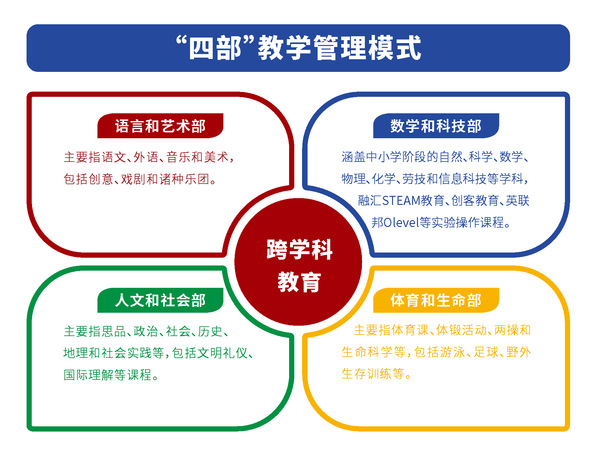 学校将中小学阶段国家规定的所有学科统整为“四部”,即“语言和艺术部”、“数学和科技部”、“人文和社会部”和“体育和生命部”,亦即学生学习的四大领域,据此构建教研组,以便日后开展跨学科教学和主题教学研究,以及联通学生学习和社会的关系,培养具有服务意识的未来公民。