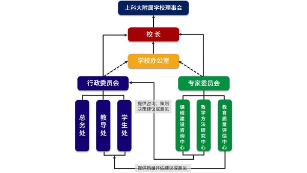 学校实行“理事会领导下的校长负责制”。为保证学校的办学理念和培养目标得以落实,拟设“行政委员会”和“专家委员会”两大机构。行政委员会负责学校日常工作运转;专家委员会则提供咨询、策划、决策和评估的建议或意见。行政委员会下辖学校办公室,由教导处、学生处和总务处构成。专家委员会下辖“课程建设咨询中心”、“教学方法研究中心”、“教育质量评估中心”。专家委员会由著名基础教育专家兼职担任,对课程和教学的建议将提交行政委员会,后者集体讨论,予以审议,如果采纳则交予相关处室执行。另一方面,专家委员会有责任对相关处室的执行情况进行评估,并将结果反馈行政委员会。其构架的基本指导思想有三:一是构建“小行政,大教育”的管理模式,集中精力聚焦教育教学;二是基于此模式,纵观“九年一贯”,精简处室名目,便于扁平管理;三是强化专家功能,提升办学品位,提高办学质量。